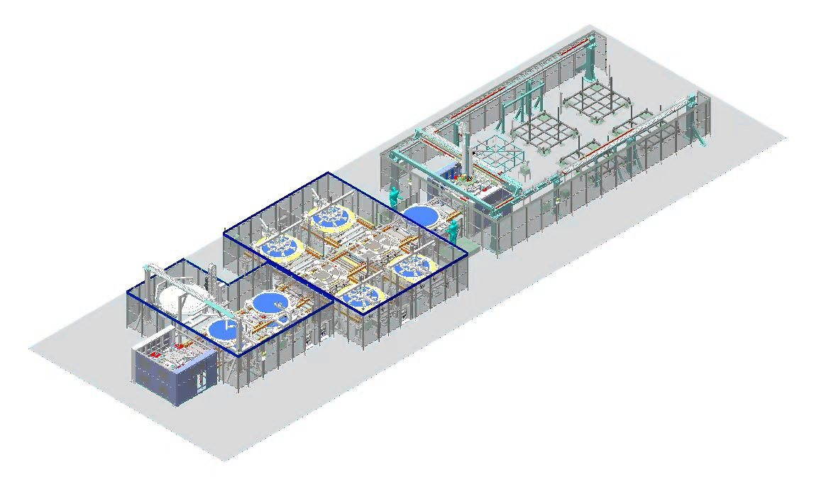 2)特点和功能:高精度“行车”,外形长14米,宽7.5米,高5米的三轴龙门,重复定位精度±0.03mm;人工上料,视觉定位抓取,视觉二次矫正,能够保证产品抓取后放置到托盘上的定位精度,实现柔性化设计;产品下线,合格件与不合格件下线均在此工位进行。