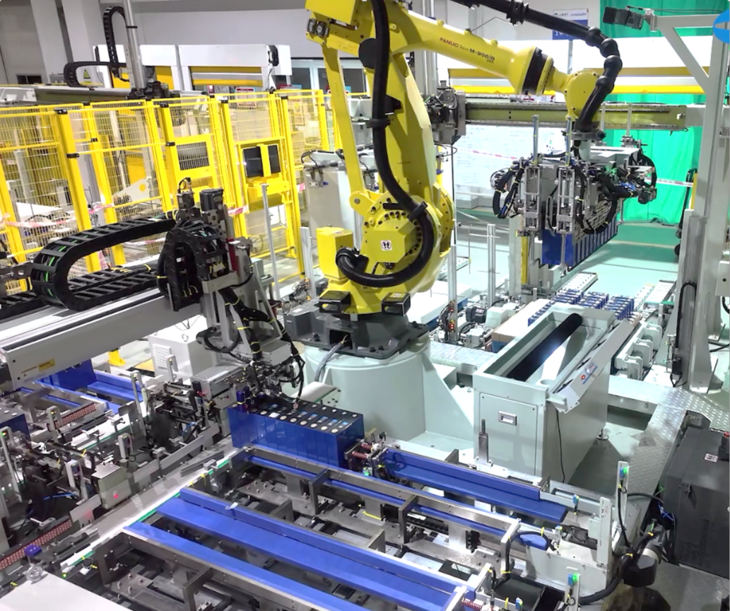 包括组装,清洗,贴胶,焊接及测试等工艺。其中主要工位有电芯自动上料,电芯OCV测试、电芯等离子清洗、电芯贴胶、贴胶检测、电芯堆叠、中间环氧板装入、端面环氧板装入、自动扫码校验、纤维胶带粘贴、模组挤压整型、模组全尺寸检测、极柱拍照寻址、极柱激光清洗、绝缘测试、汇流排上料、模组焊接、自动焊后检查、焊后清洁、贴NTC、NTC点胶及烘干、自动EOL测试、模组自动下线。
